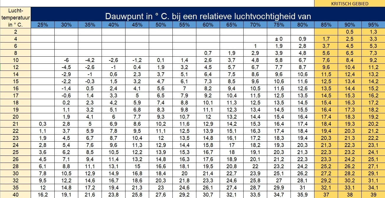 Ligt de oppervlaktetemperatuur te dicht bij het dauwpunt, dan is de kans op problemen groot, ook als de luchttemperatuur nog acceptabel lijkt.