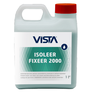 Na voldoende droging van de gereinigde ondergrond volgt een belangrijke stap: het fixeren. Hiervoor wordt Vista Isoleer Fixeer 2000 toegepast, verdund met water in een verhouding van 1 op 3. Het product wordt aangebracht met kwast, roller of spuit, afhankelijk van de situatie, en verwerkt tot verzadiging zonder dat er druppelvorming ontstaat. Eventueel wordt nagerold met een droge roller. Met deze behandeling worden zuigende en poederende delen vastgezet, wat zorgt voor een stabiele en goed hechtende basis voor de verdere opbouw.